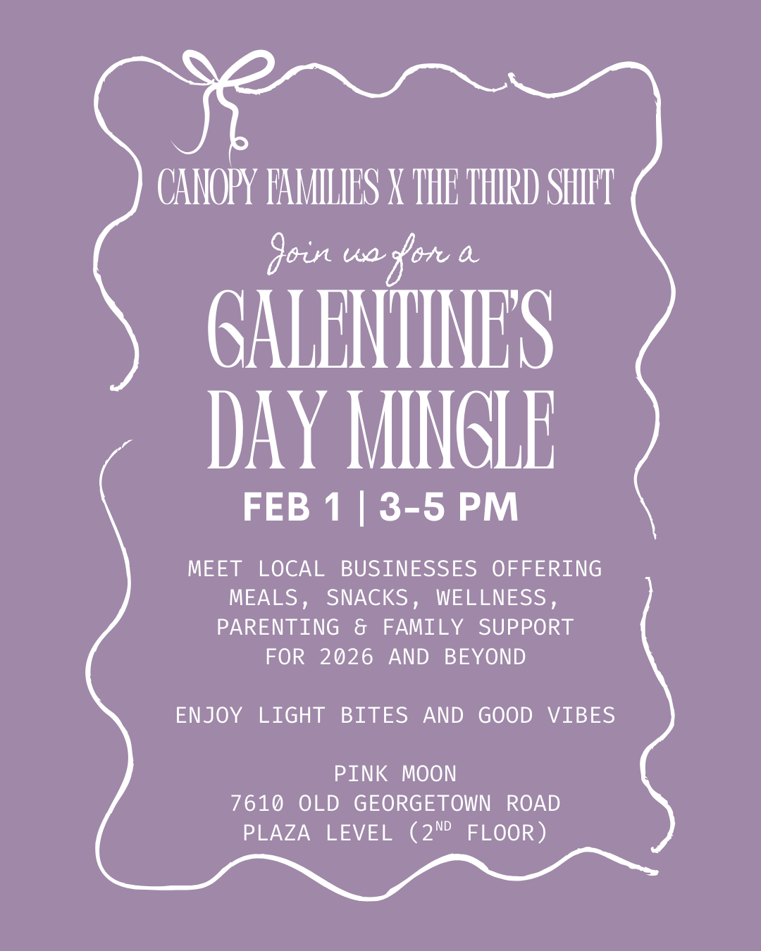 Join Canopy Families, The Third Shift, and Pink Moon for an afternoon of light bites, warm drinks and gifts that can make your life easier.